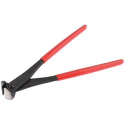 Professional Quality, manufactured from special high grade tool steel, oil hardened and tempered. Smoothly ground heads and faces with cutting edges separately induction hardened to 61HRC for cutting hard or medium-hard wire and soft annealed tie wire used on reinforcing rods. Plastic coated handles. Display packed.