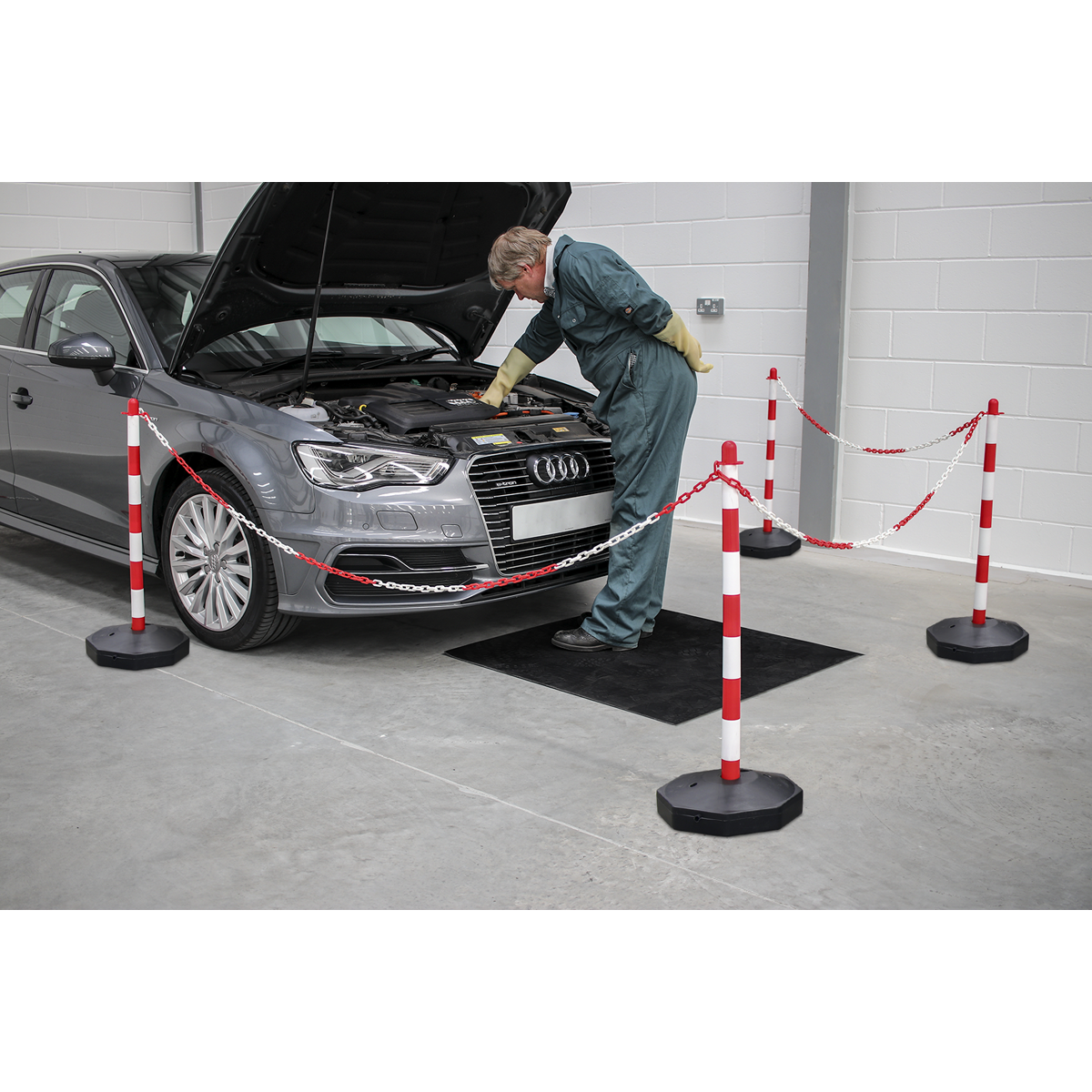 Highly visible post and chain kit ideal for creating a temporary safety barrier when working on hybrid and electric vehicles. Consists of six red/white posts, six bases, 25m x 6mm red/white plastic chain and chain securing hooks. Post base can be filled with dry sand for extra stability.