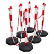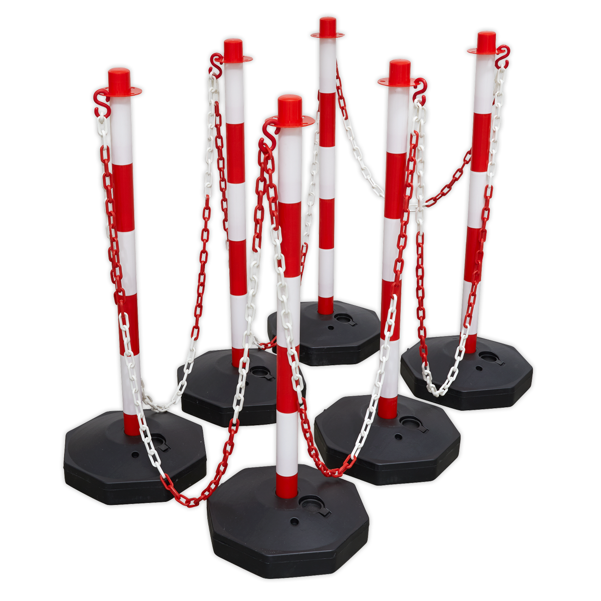• Consists of six red/white posts, six bases, 25m x 6mm red/white plastic chain and chain securing hooks.