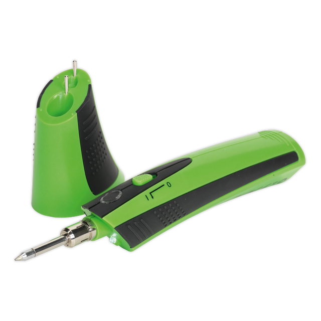 Ideal for multiple applications including automotive soldering in-and-around engine bays. Much safer than using conventional gas powered soldering irons. Powered using lithium-ion battery technology which enables faster heating times and improved battery life. Heats up to maximum temperature in 25 seconds. Unit is charged and stored in the base and is supplied with a mains charger.