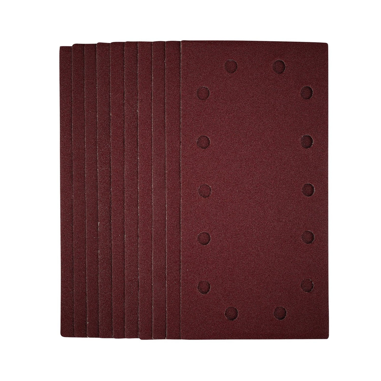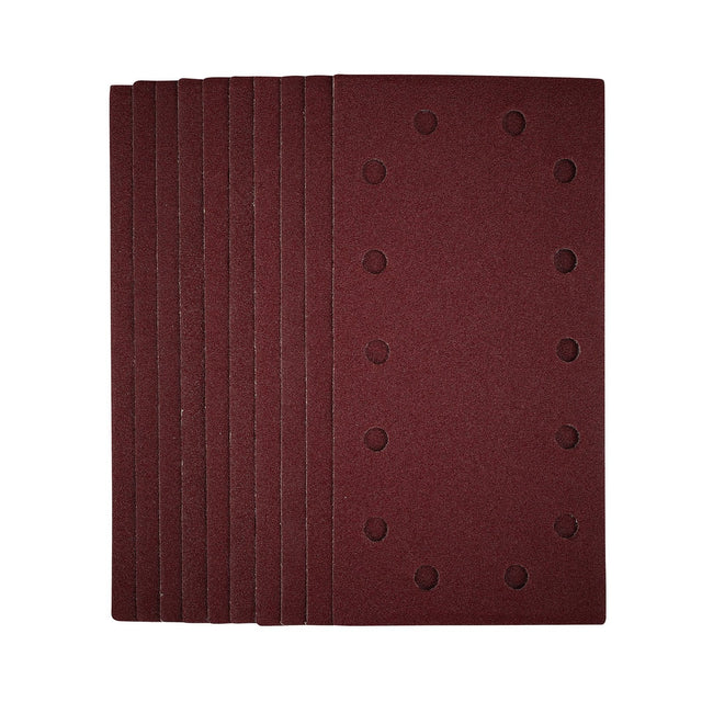 This pack of 1/2 sanding sheets (115 x 230mm) are made from premium quality aluminium oxide that is resin bonded to provide improved grain adhesion, anti-static qualities and long-lasting performance. The heavy-duty E-Weight backing paper makes the sanding sheet more durable - able to withstand the toughest jobs. The hook and loop backing offers decent adhesion to facilitate the fast changing of sanding sheets. The 14 pre-punched 8mm holes improve dust extraction. Ideal for sanding and finishing wood, metal, aluminium alloy, painted surfaces, plastic and fillers. Compatible with most 1/2 sanders with hook and loop including Stock No. 57941.