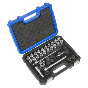 • 33PC SET – Contents: 3/8"Sq Drive Extension Bar; 75, 150mm, 3/8"Sq Drive 200mm Sliding T-Bar, 3/8"Sq Drive Square; 7, 8, 10, 11, 12, 13, 14, 5/16", 3/8", 3/8"Sq Drive Hex; 8, 9, 10, 12, 13, 14, 17mm, Triangle; 10mm (PSA) Security Spline; M16, Square Female; 10mm, TRX-Star*; T45, T-Handle Oil Drain Plug Key, 3pc Special parts for Ford/Land Rover/BMW/VW/Audi, 1pc Special Socket for Japanese Cars.