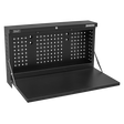 Wall mounted foldable workbench ideal for garages and workshops where space is at a premium. Heavy-duty hammered metal workbench with 100kg capacity. Supplied with 600mm wall mount bracket and hardware pack. Back panel pegboard design compatible with Sealey TTS Hooks with a 10cm deep gap for tool storage. Lockable design for added security of contents within. Also features two cable and plug grommet holes either side for corded tools or power strip. Overall size: 914 x 620 x 560mm.