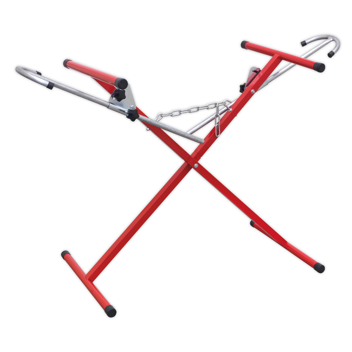 Ideal for storage of bumpers prior to preparation and spraying. Adjustable stand width with extendable arms makes this unit suitable for holding various types and styles of bumpers. Folds away for easy storage.