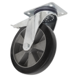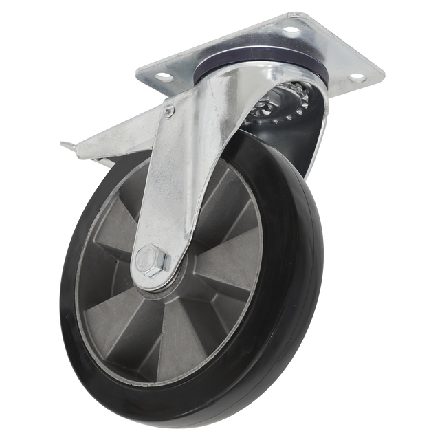 Heavy-duty swivel castor with total lock. Moulded rubber wheel with cast aluminium core.
