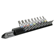 Forged Chrome Vanadium steel sockets with S2 steel bits. Heat treated and chrome plated with a fully polished micro satin finish. Colour-coded rings for fast identification. Supplied on anodised aluminium socket rail with lockable nylon clips.