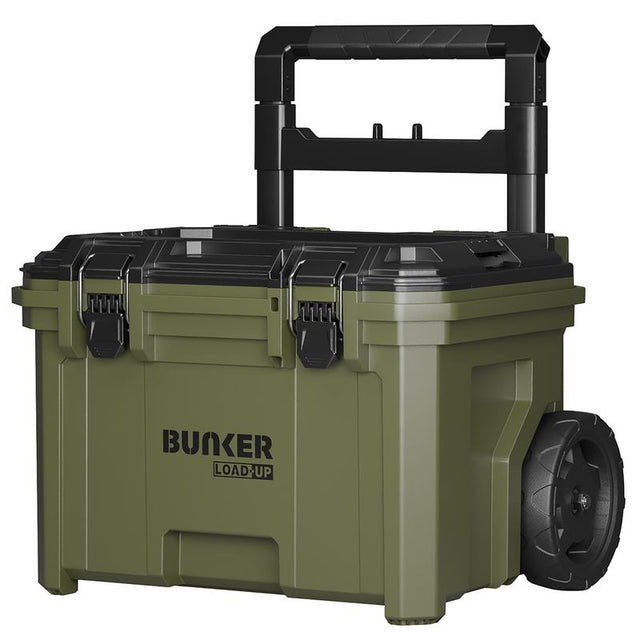 The BUNKER Load-Up Stacking Storage System offers the ultimate solution for organising, transporting, and securing your tools. Its modular design enables you to combine tool boxes, organisers and crates to maximise your storage capacity and keep everything in its place. This wheeled tool box can provide the base for your stack when transporting your tools between jobs. Constructed from high-impact resistant polypropylene, this rolling tool box offers exceptional durability. Its fast and reliable interlocking mechanism ensures that your stack remains stable, no matter the conditions. With IP65 protection against water and dust, this system effectively shields your valuable tools from the harsh elements and jobsite debris. The strong, telescopic pull handle and durable wheels ensure maneuverability and easy transport, while the spacious interior of the rolling toolbox offers ample storage for larger tools and equipment. The lift-out tool tray provides more organisation and keeps frequently used tools readily accessible. For added security, the system is lockable (padlock not included) to deter theft and unauthorised access. The side rails for BUNKER Load-Up system accessories allow for further customisation and expanded storage options when used with BUNKER Load-Up Side Rail Hooks (Stock No. 31650). All BUNKER® storage comes with a 12-month warranty, extended to 10 years upon registration. Optimise your mobile tool storage and be ready for any job with the adaptable and robust BUNKER Load-Up Stacking System.