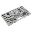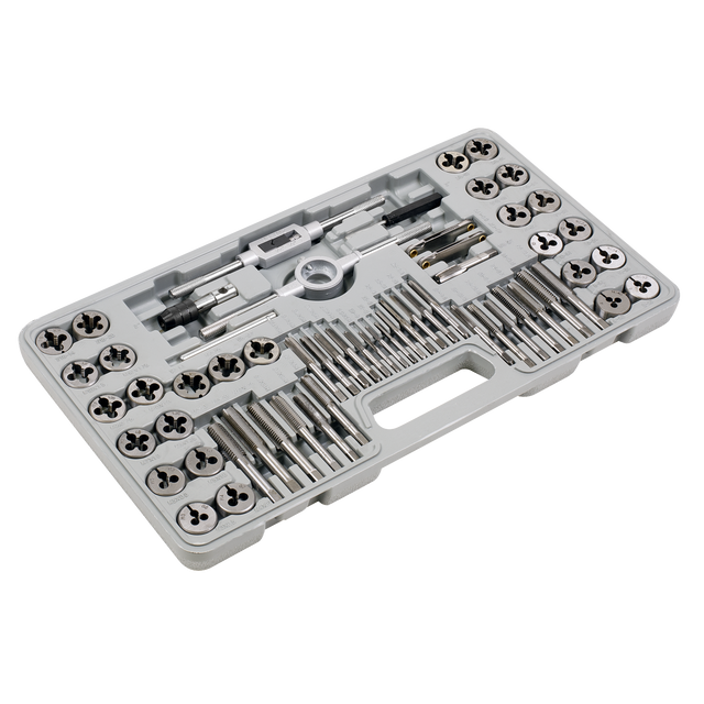 • Contents: Taps and Dies; 3 x 0.5, 4 x 0.7, 5 x 0.8, 6 x 1.0, 7 x 1.0, 8 x 1.25, 9 x 1.25, 10 x 1.5, 10 х 1, 12 х 1.75mm, 4-40, 6-32, 8-32, 10-24, 10-32, 12-24, 1/4"-20, 1/4"-28, 5/16"-18, 5/16"-24, 3/8"-16, 3/8"-24, 7/16"-14, 7/16"-20, 1/2"-13, 1/2"-20, 1/8"-27, Die Handle, Double End Tap Wrench, T-handled Tap Wrench, Metric Screw Pitch Gauge, Imperial Screw Pitch Gauge and slotted 5mm Screwdriver.