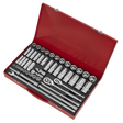 Deluxe professional socket set with heat treated Chrome Vanadium steel WallDrive® sockets. Dual satin/chrome finish. 48-Tooth gear-to-gear quick release ratchet. Supplied in metal storage case.