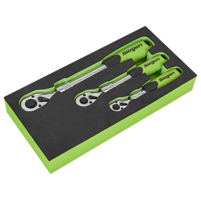 1/4", 3/8" And 1/2"Sq drive Chrome Vanadium steel extendable ratchet wrenches. 72-Tooth ratchet action with flip reverse and quick release mechanism. Hardened and tempered with fully polished mirror finish. Quick release locking ring retains extension at set increments, giving different shaft lengths for increased access in space restricted applications. Soft grip handle for added comfort and control. Supplied in EVA foam storage tray.