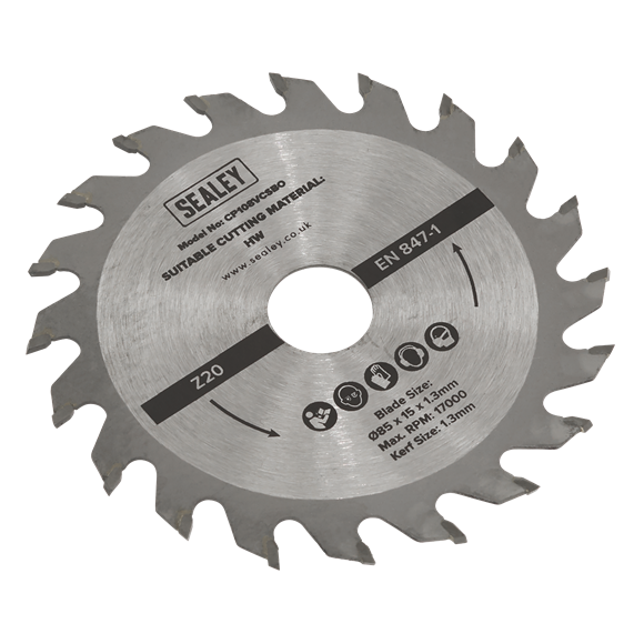 Tungsten carbide tipped (TCT) saw blades with hardened steel teeth. Suitable for circular saws such as Model No. CP108VCSBO. Size/Bore: Ø85 x 1.3mm/Ø15mm. Will fit compatible Sealey models and other brands of circular saw.