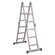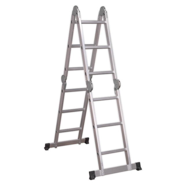 EN 131 Certified 4-way, 4-section, aluminium ladder. Six robust auto-latching locking hinges allow for multi-positioning. Can be used as a platform, straight ladder, step ladder or offset ladder. Extra safety provided by 12 reinforced rungs and stabiliser feet. Fitted with extendable legs providing increased climbing height. Supplied with metal platforms to use in platform/scaffold position.