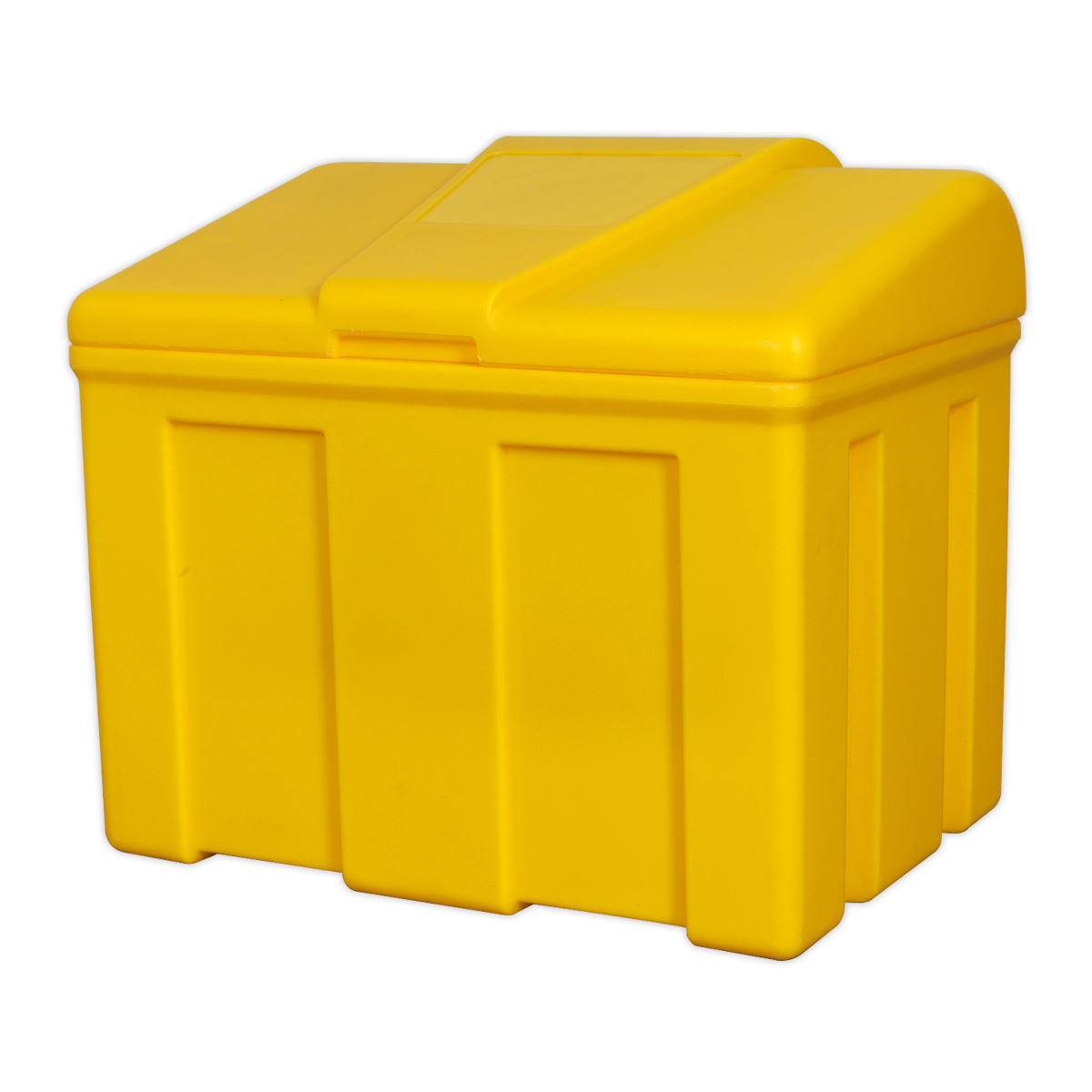 Manufactured from hard-wearing polyethylene. Ideal for indoor and outdoor storage of grit, sand and salt. Angled lid forces water to run off, keeping contents dry. Features large opening for easy-access.