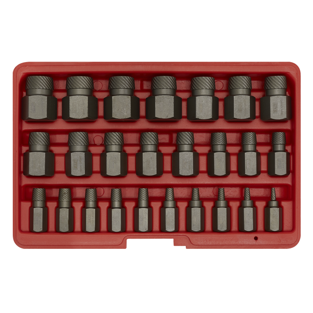 Manufactured from heat treated Chrome Molybdenum steel, designed to remove broken studs and bolts. Reverse spiral design for maximum grip and hex shaped head. Recommended drill bit size (for pilot hole) etched on each extractor, suitable for high torque applications. Supplied in storage case.
