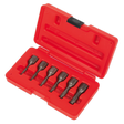 Designed to remove broken bolts and studs without damaging the casing. Manufactured from heat treated Chrome Molybdenum steel. Reverse thread spiral design for maximum grip, with recommended drill bit size (for pilot hole) etched on each extractor. Suitable for use with 3/8''Sq drive ratchets. Supplied in storage case.