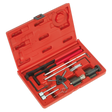 Comprehensive kit covering engine timing and belt replacement on VAG 1.2-2.0D Pumpe Duse and 1.2, 1.6, 2.0D common rail diesel engines. Also covers these engines fitted in Ford, Dodge and Mitsubishi models. Kit contains crankshaft locking tools for both oval and round crank gears, camshaft locking pins and tensioner adjustment tools. Supplied in storage case.