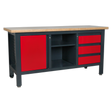 Heavy-duty powder coated metal frame with a 40mm MDF work surface. Storage splits into 3-sections with a choice of cupboards, drawers and an open space with an adjustable shelf. All cabinet drawers fitted with ball-bearing slides and cupboards include a hanging pegboard on the inside of the door. Fully lockable and features adjustable feet to help stability when placed on an uneven surface. Supplied flat-packed with two keys.
