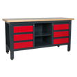 Heavy-duty powder coated metal frame with a 40mm MDF work surface. Storage splits into 3-sections with a choice of cupboards, drawers and an open space with an adjustable shelf. All cabinet drawers fitted with ball-bearing slides and cupboards include a hanging pegboard on the inside of the door. Fully lockable and features adjustable feet to help stability when placed on an uneven surface. Supplied flat-packed with two keys.