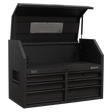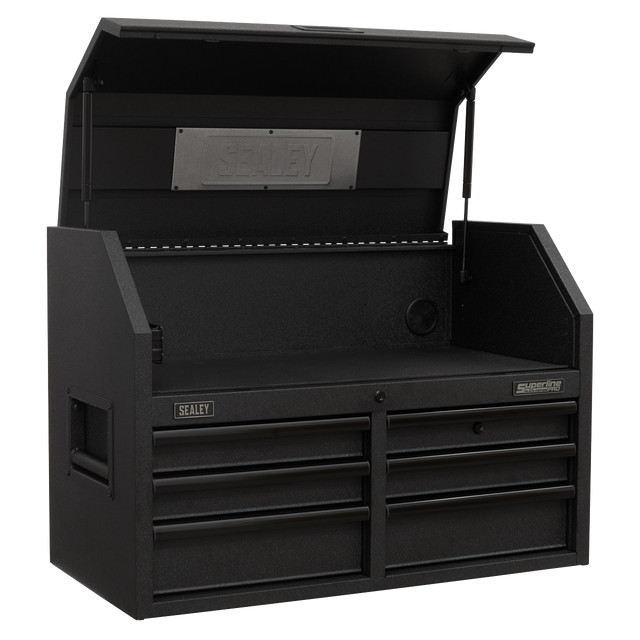 All heavy gauged steel construction and manufactured with steel inner walls for extra strength and durability. Heavy-duty 45mm ball-bearing drawer slides provide superior performance, suitable for heavier loads. Full height rear locking mechanism, locks smooth running soft close drawers in place. Rust and solvent resistant black crinkle effect finish. Clamshell style topchests feature robust side handles and are supplied with a power strip (4 x 230V, 2 x 5V 2.4A USB sockets) which can be installed on either side. Also features an independent drawer that can be locked separately to other drawers allowing belongings/valuables to be kept safe whilst other drawers are in use. Each drawer features stylish black anodized heavy-duty drawer pulls plus pre-cut non-slip liners. Supplied with two folding keys.