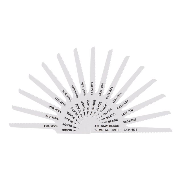 HSS Air saw blades suitable for Sealey and other leading makes of air saw. Contents: 14tpi Saw Blades (x3), 24tpi Saw Blades (x9), 32tpi Saw Blades (x3). Supplied in a pack of 15.