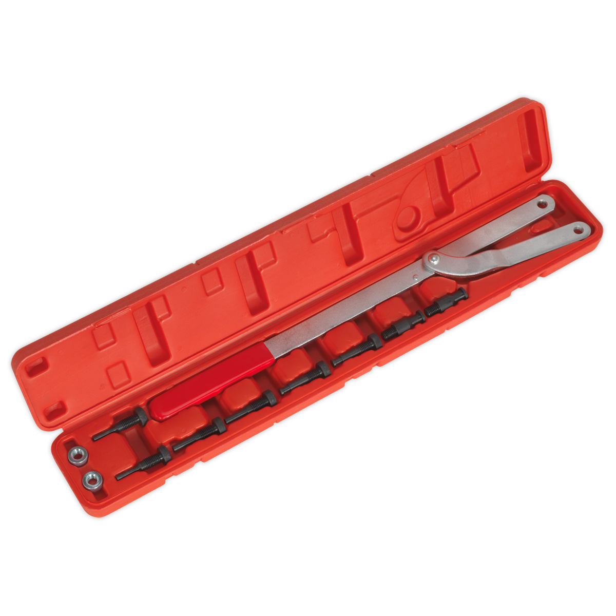 Designed to remove and install fan clutch and rotate or restrain the camshaft pulley. Adjustable jaw spread and interchangeable pins. Supplied in storage case.