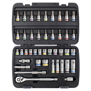 • Contents: Standard Sockets; 8, 9, 10, 11, 12, 13, 14, 15, 16, 17, 18, 19, 22, 24mm, Deep Sockets; 8, 10, 13, 17, 19mm, Hex Socket Bits; 4, 5, 6, 7, 8, 9, 10, 11, 12mm, TRX-Star* Socket Bits; T10, T15, T20, T25, T27, T30, T40, T45, T50, Ratchet, Extension bars; 75, 150mm, Universal Joint, T-Bar Adaptor.