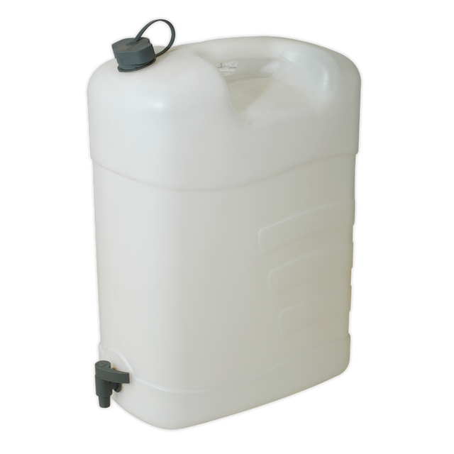 • 35L Polyethylene fluid container with attached screw cap and tap for easy fluid control.