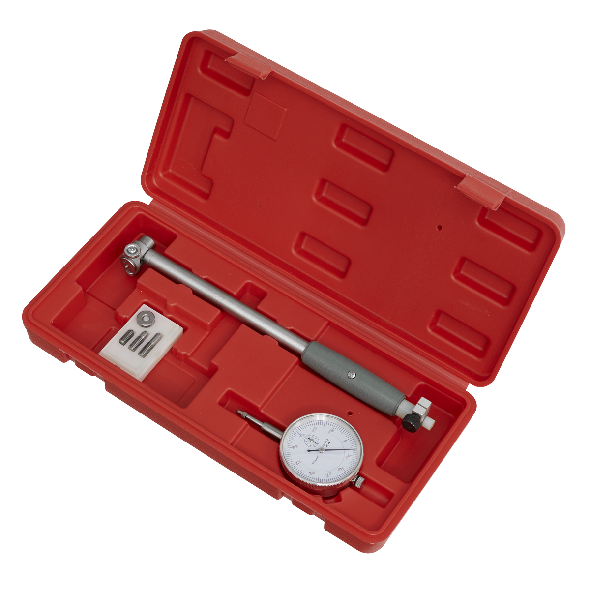 Precision mechanism with Ø58mm dial and locking rotating bezel, offering an accurate method of measuring a bore or detecting a taper or ovality. Will indicate the deviation from set size by up to 5mm with an accuracy of 0.01mm. Probe body, dial indicator, anvils and spacer rings are also included. Supplied in BMC.