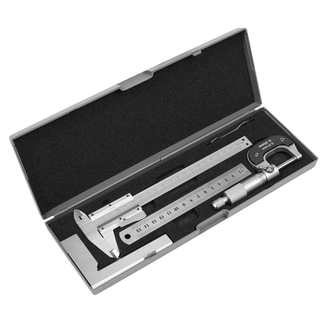 • Contents: 200mm Vernier Caliper, 0-25mm Micrometer, 100 x 70mm Bevelled Edge Square, 150mm(6") Stainless Steel Rule.