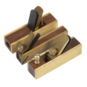 Mini Brass Plane Set constructed from solid brass and rosewood. Includes a Bull Nose Plane, Block Plane and Scraper Plane. Ideal for small precise carpentry work and restricted access. Perfect for meticulous detailed work in many different applications, including model making. Perfect for detailed trimming, wood planing and surface smoothing.
