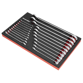 Drop-forged Chrome Vanadium steel spanners. Hardened and tempered with a fully polished, mirror finish. Open-end and WallDrive® ring combination with long slim shaft. Supplied In EVA foam storage tray.