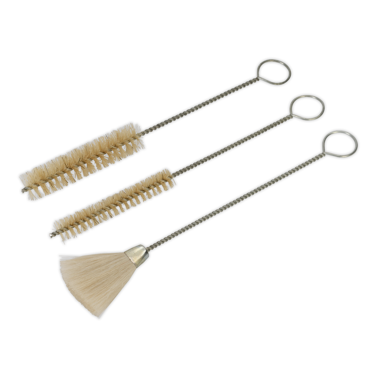 Ideal for cleaning the inside and outside of spray guns after use. Three different sizes and styles, spray gun brushes. For use with thinners and cleaning solvents. Loop end for easy hanging and storage.