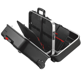 00 21 41 LE Tool Case "BIG Twin Move" With a total of 95 inserting options. Max. payload: 30 kg. Volume: 38 litres. Base tray, can be fixed by a push button, 70 mm high, can be subdivided by inserts, cover board with 13 tool pockets. Free-standing in all opening positions thanks to snap-in cover holders with hinge mechanism on both sides, angle freely adjustable. Removable document compartment and removable tool boards made from dirt-repellent PP twin-wall sheets with 13 tool pockets. Label field with two stickers for individual labelling. Telescopic handle set in the base as well as two external, smooth-running skater wheels. Heavy duty ABS material, black. Circumferential aluminium frame with securely mounted, sturdy centre wall that can be fitted on both sides, with versatile inserting options due to elasticated loops and twelve small pockets. Metal hinges. Three-digit combination lock for secure locking of the case. Two metal tilt locks each for fixing the cover and the base. Can be opened from one or both sides; bottom and lid can be opened independently of each other. - Dimension exterior (interior) width mm: 520mm 490mm- Dimension exterior (interior) height mm: 435mm 370mm- Dimension exterior (interior) depth mm: 290mm 110mm