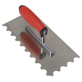 Ideal for use with mosaic tiles. The semicircle design dispenses less adhesive. Designed for applying and spreading tile adhesives, hardwood floor applications and tile thinset mortar. A notched tile trowel also acts as a metered dispensing system, delivering just the right amount of mortar for the tile. Rubber soft grip, ergonomic two-component handle for prolonged periods of work in comfort. Stainless steel, high quality, highly durable and rust resistant. Precision made blade. Well balanced and flexible. Aluminium foot for lightweight strength and durability. Ideal for brickwork and plasterwork with mortar, putty, plaster, and adhesives. Part of the Sealey wide range of trowels, floats and building equipment.