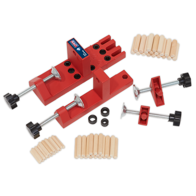 • Contents: Dowelling Jig, Alignment Clamps, Dowel Pins; 6, 8, 10mm (20 of each), Drill Bit Depth Stops; 6, 8, 10mm.