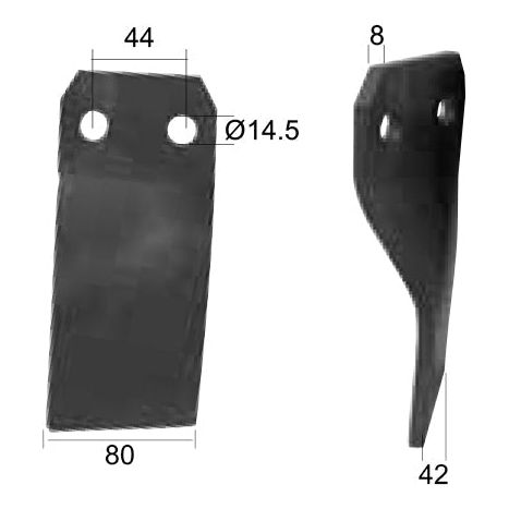 Rotavator Blade Twisted RH 80x8mm Height: Hole centres: 44mm. Hole Ø: 14.5mm. Replacement for Maschio To fit as: 26100417 | Sparex Part No.S.77270 is backordered and will ship as soon as it is back in stock.