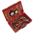 Comprehensive kit of adaptors and fittings for modern petrol fuel injection systems. Components fitted with quick coupling system and safety valve to prevent inadvertent discharge of fuel under pressure. Supplied with large high pressure gauge reading 0-145psi and 0-1000kPa and a small low pressure gauge for accurate low pressure readings. Pressure release valve fitted with long drain hose allows safe recovery of fuel. Supplied in storage case.